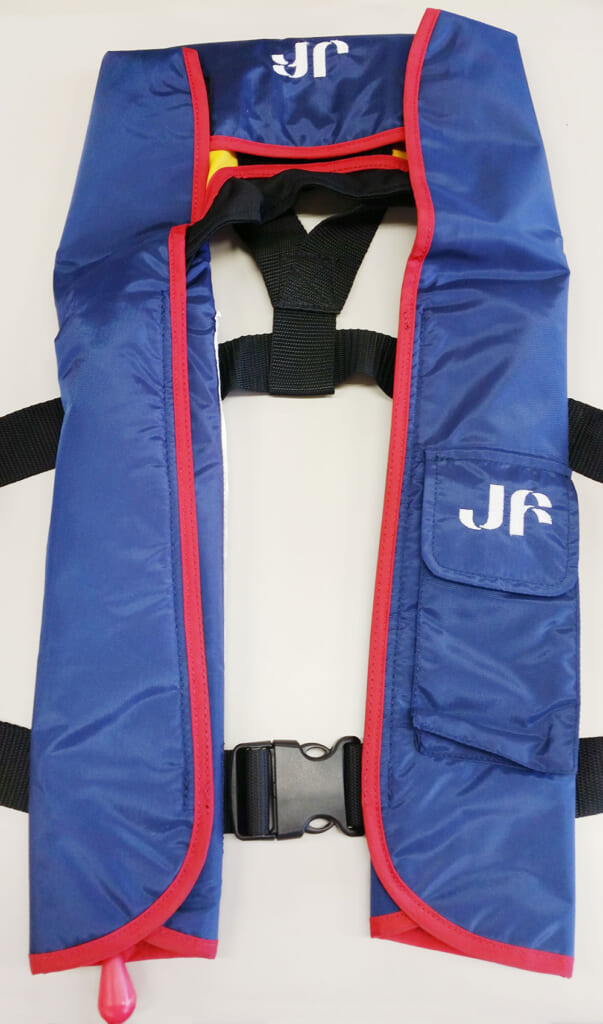 漁業者の要望を取り入れた自動膨張式ライフジャケット(救命胴衣)。