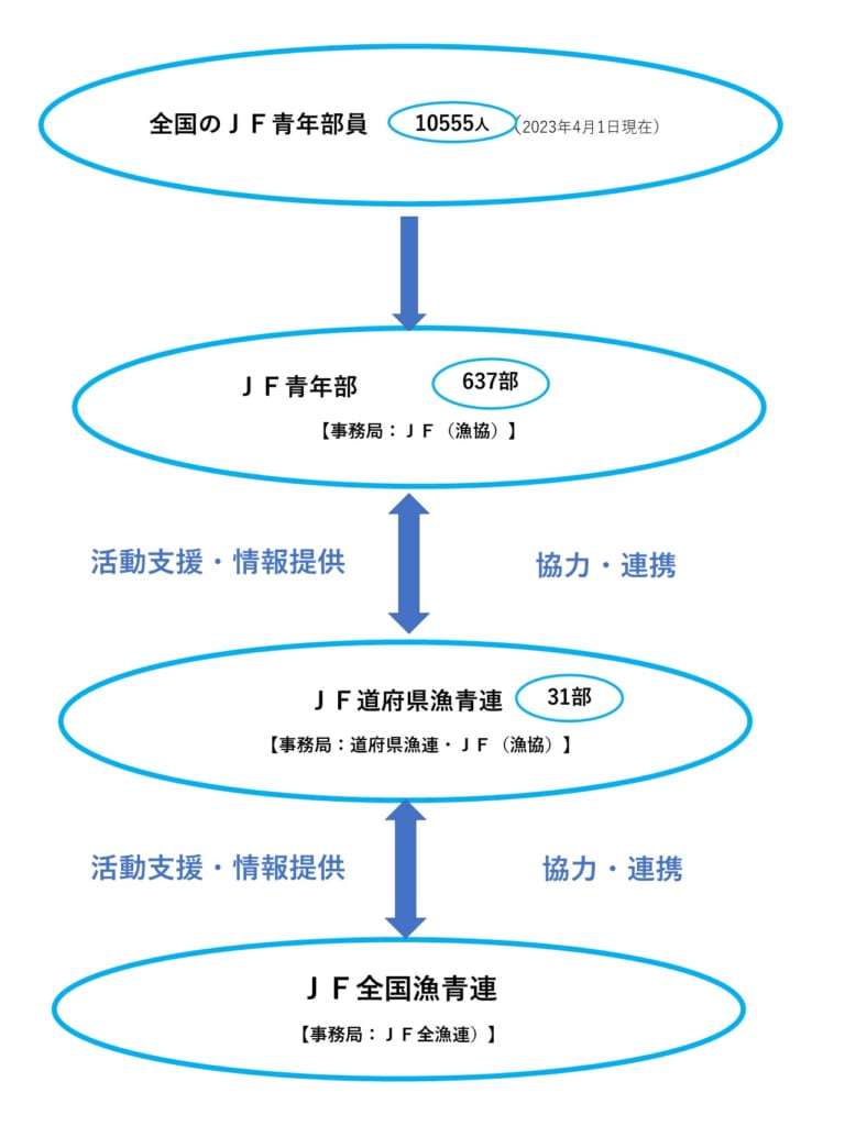 | 組織構成 | <2023年4月1日現在> 全国段階漁協青壮年部(JF全国漁青連) 1部 道府県段階漁協青壮年部(JF道府県漁青連) 31部 漁協青壮年部 637部(部員数10,555人) |