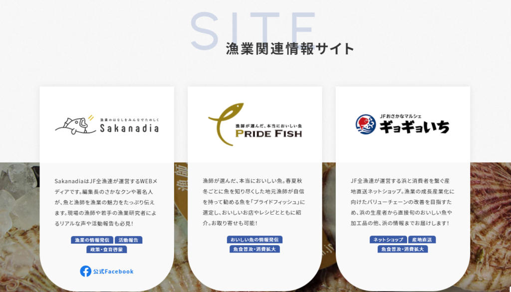 トップページでは、消費者が「知る・買う」などの目的のウェブサイトにアクセスしやすいよう「漁業関連情報サイト」をまとめました。