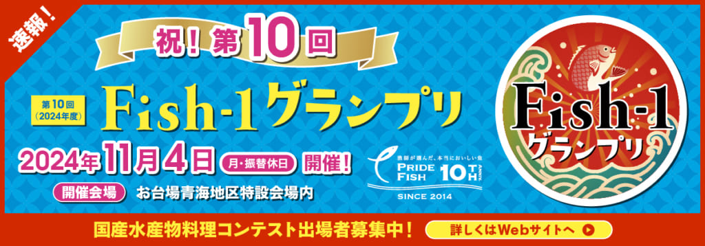 JF全漁連は2024年11月4日(月・振休)、「第10回Fish-1グランプリ」を東京・お台場青海地区特設会場で開催いたします(「SAKANA & JAPAN FESTIVAL(魚ジャパンフェス)2024 in お台場」内)。