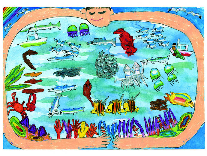 この「全国海の子絵画展」は、小・中学生の皆さんが絵を描くことを通して、海に対する興味や、漁業に対する理解、夢をもって成長して欲しいという願いを込めて、JF全漁連が1978年から開催しているものです。