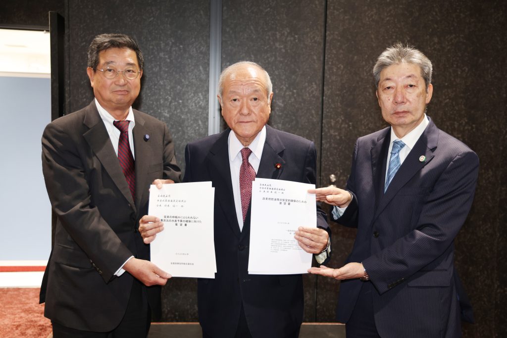会議終了後には、坂本雅信会長が自民党水産政策推進議員協議会総会に出席し、同協議会の鈴木俊一会長に対して、採択された決議事項の実現を求める要望書と「従来の枠組みにとらわれない異次元の水産予算の確保に向けた要望書」(添付資料②参照)を手渡しました。